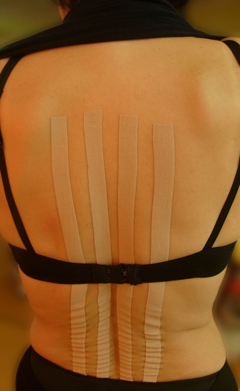 - W terapii kinesiology taping wykorzystuje się plaster (tape) o parametrach zbliżonych do właściwości skóry ludzkiej. Jest on wykonany z bawełny pokrytej akrylem medycznym, wodoodporny, przepuszczający powietrze i pozwala na prawidłową wymianę cieplną.